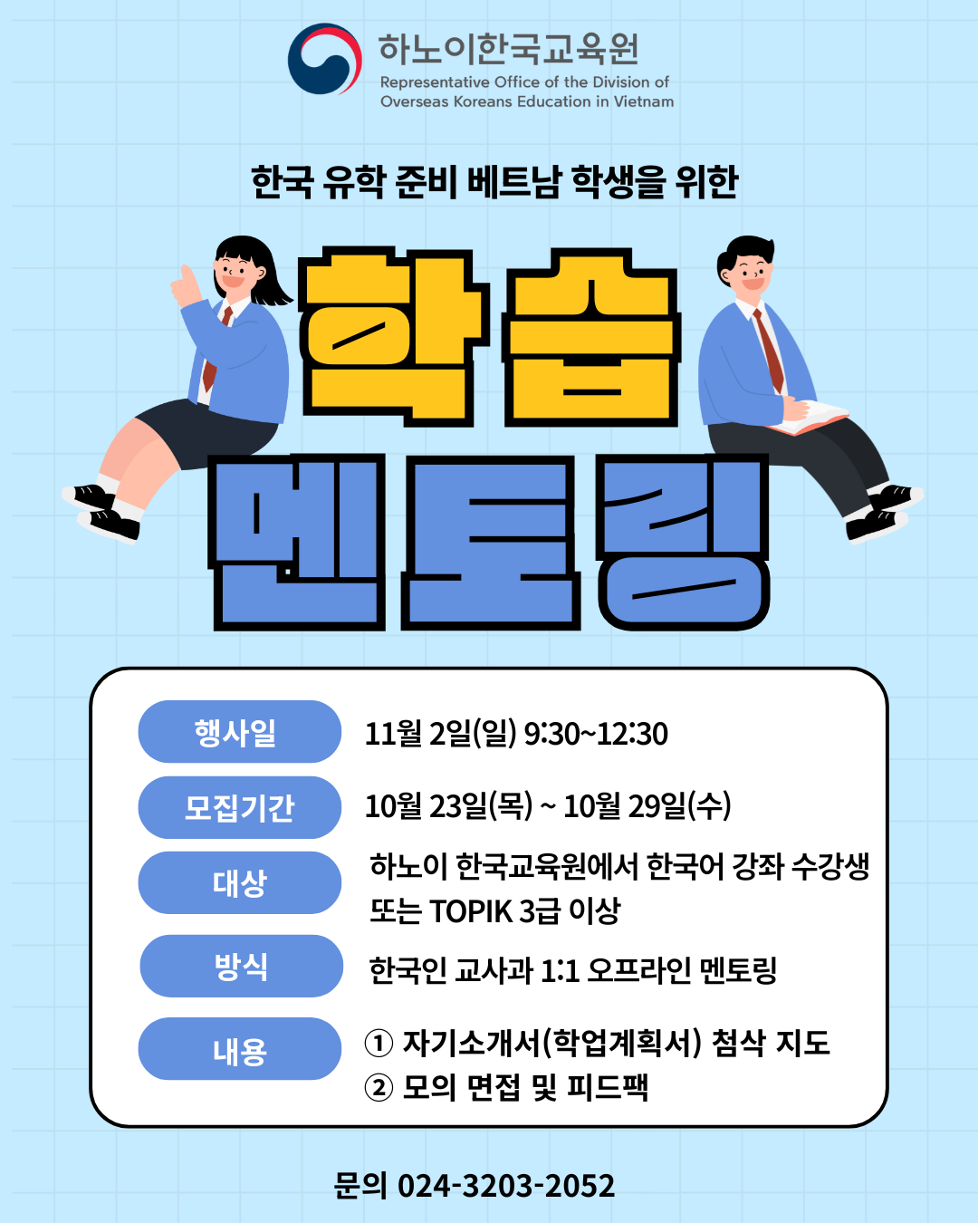 한국 유학 준비 베트남 학생 멘토링 세미나 개최 안녕하십니까? 하노이한국교육원은 한국의 대학(원) 진학을 희망하는 베트남 학생들을 대상으로, 자기소개서 및 학업계획서 작성법과 면접 대비 전략 등을 안내하는 특별 프로그램을 다음과 같이 운영합니다. 관심 있는 학생과 학부모님의 많은 참여 바랍니다. ㅇ일시/ 장소: 2025년 11월 2일(일) 9:30~12:30/ 하노이한국교육원 ㅇ모집기간: 10월 23일(목)~10월29일(수) ㅇ진행 방식: 한국인 교사과 1:1 멘토링 *통역 지원 ㅇ참가 방법: 구글폼을 통해 신청 https://forms.gle/wh5X8a3LNpuj3J8k6 ㅇ문의처: 하노이한국교육원/ 024-3203-2052